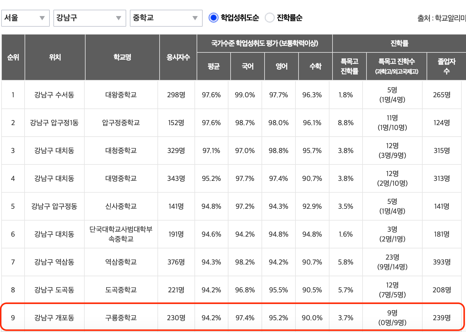 강남지역 학업성취도 순으로 보니 개포중학교가 94%가 넘네요.